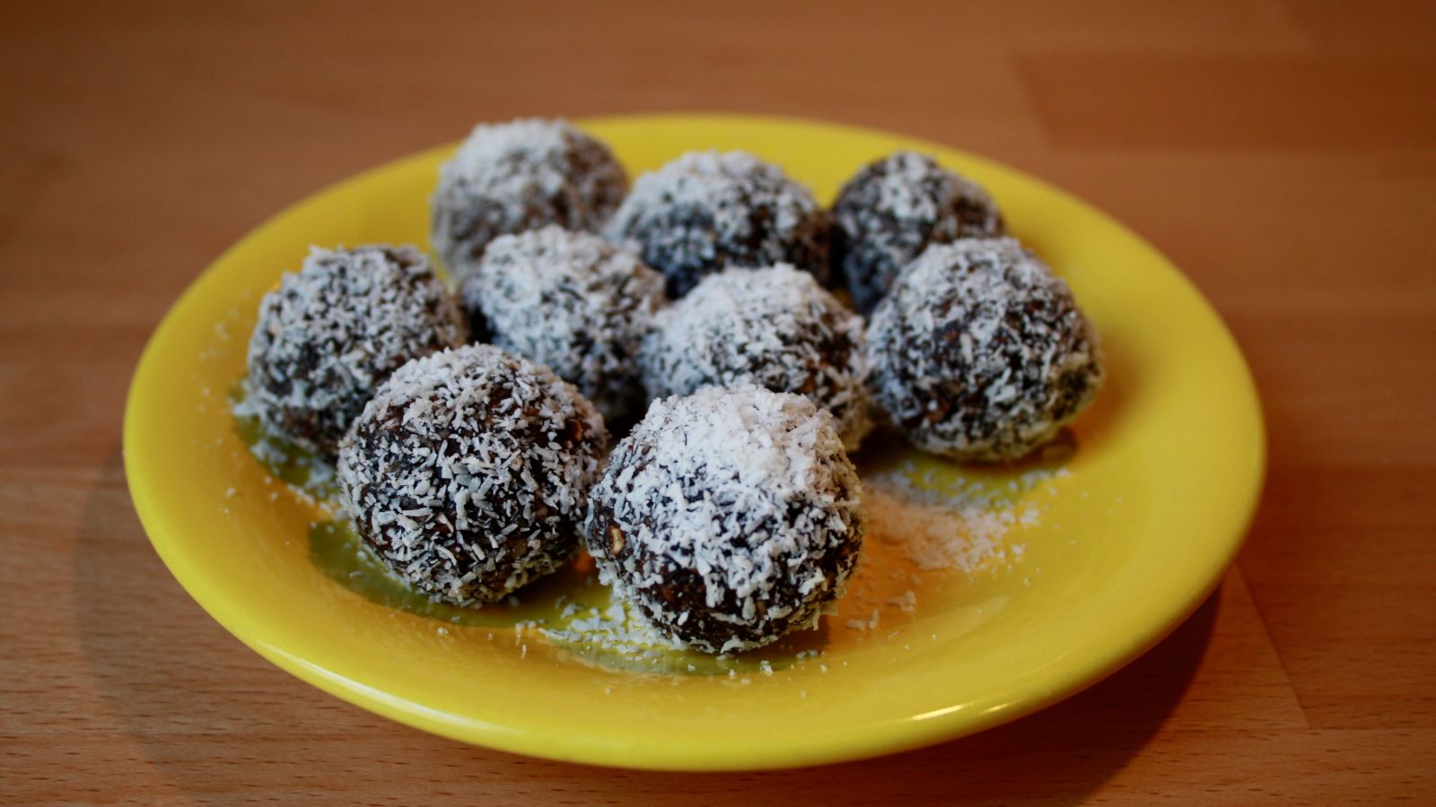 - Datteln mit einem Messer grob zerkleinern und dann alle Zutaten, bis auf die Kokosraspeln, in einen Mixer geben und solange mixen bis ein gleichmäßiger Teig entsteht. Diesen nochmal mit den Händen durchkneten.