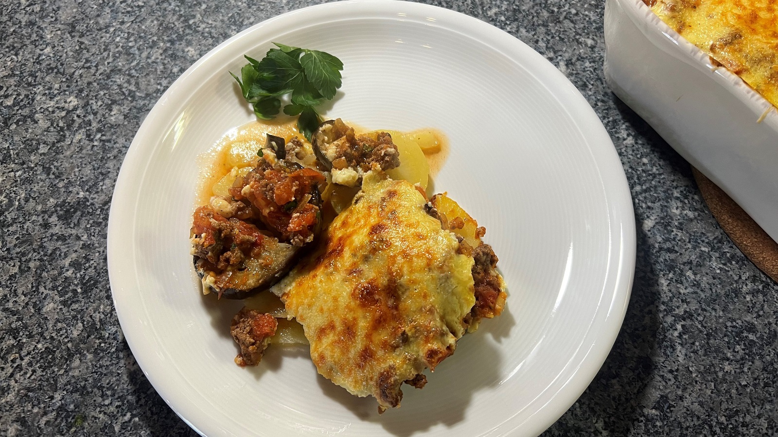 - Kartoffeln gleichmäßig in die Form schichten, Auberginen darauf anordnen und mit dem Hackfleisch-Tomaten-Mix bedecken.