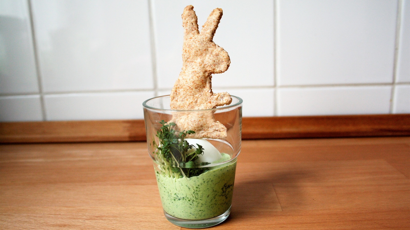 - Nun die Soße in die Gläser geben, die Eier schälen, einzeln in die Gläser stellen und mit dem Rest Kresse und den Teighasen garnieren.