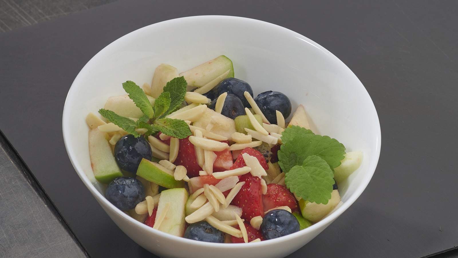 - Obst waschen, putzen und ggf. in etwa gleich große Stückchen schneiden. Alles in eine große Schüssel geben.