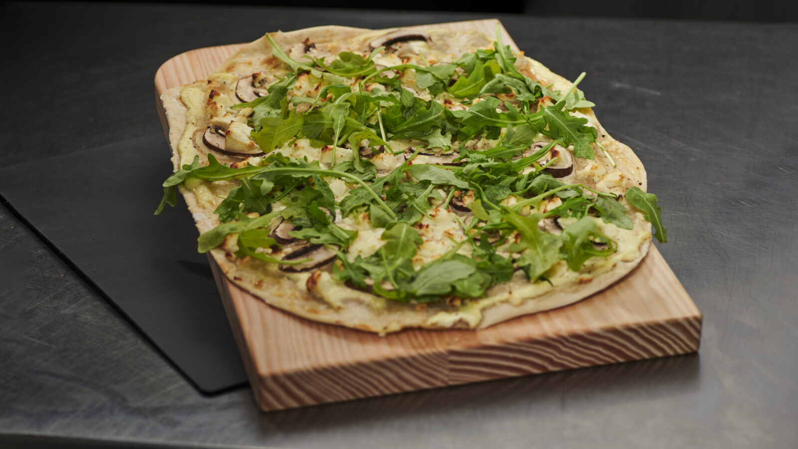 - Rucola waschen, trockenschütteln und auf dem Flammkuchen verteilen, ggf. noch mit Pfeffer würzen.