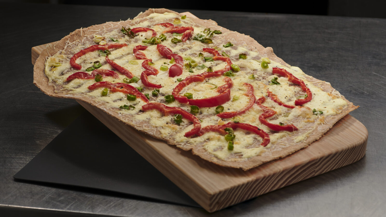 - Zwiebel- und Paprikaringe auf dem Flammkuchen verteilen, Käse und ggf. Pfeffer darüber streuen.