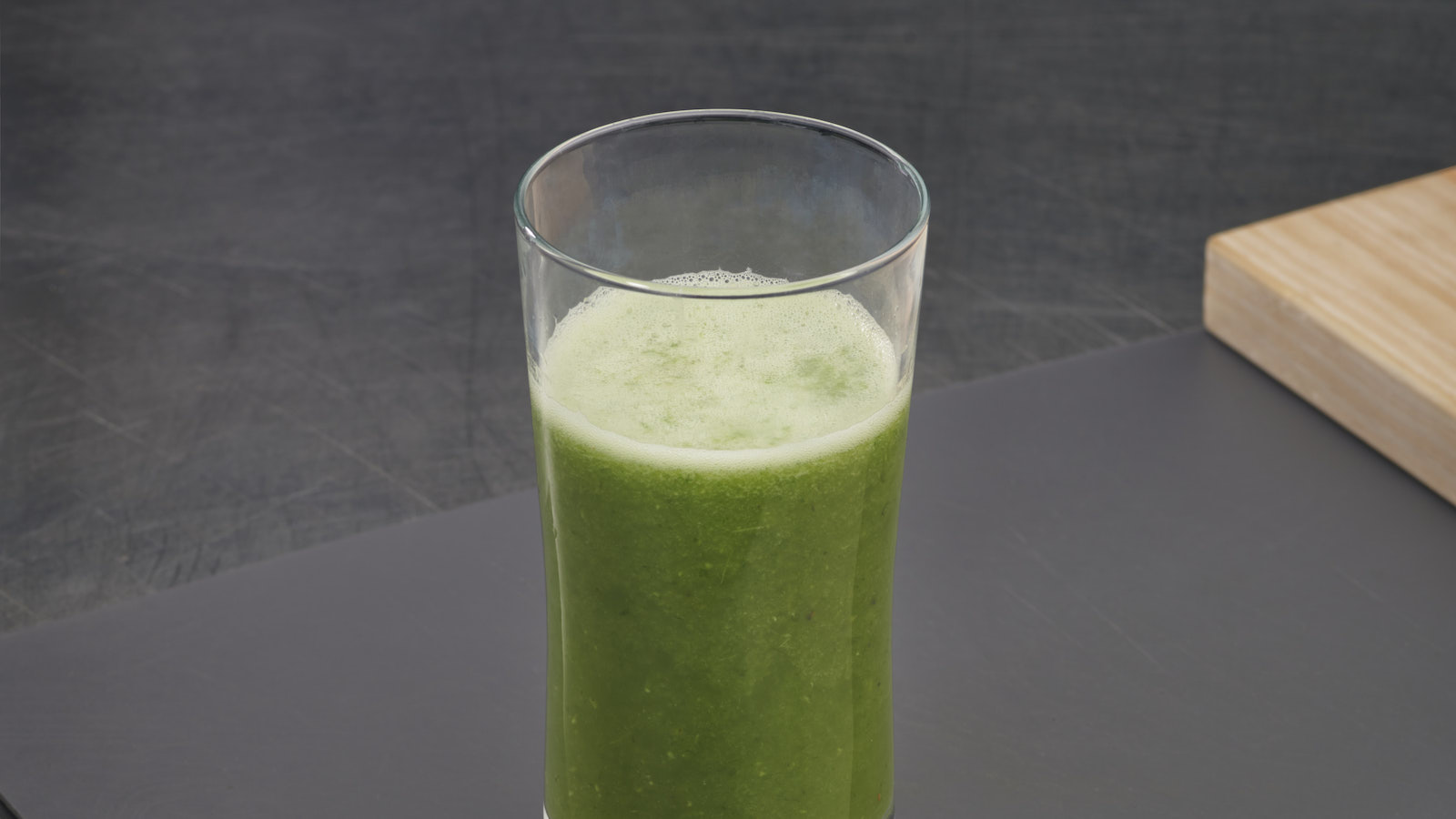 - Alle Zutaten, auch den Saft, in ein hohes Gefäß geben und mit dem Pürierstab fein pürieren.