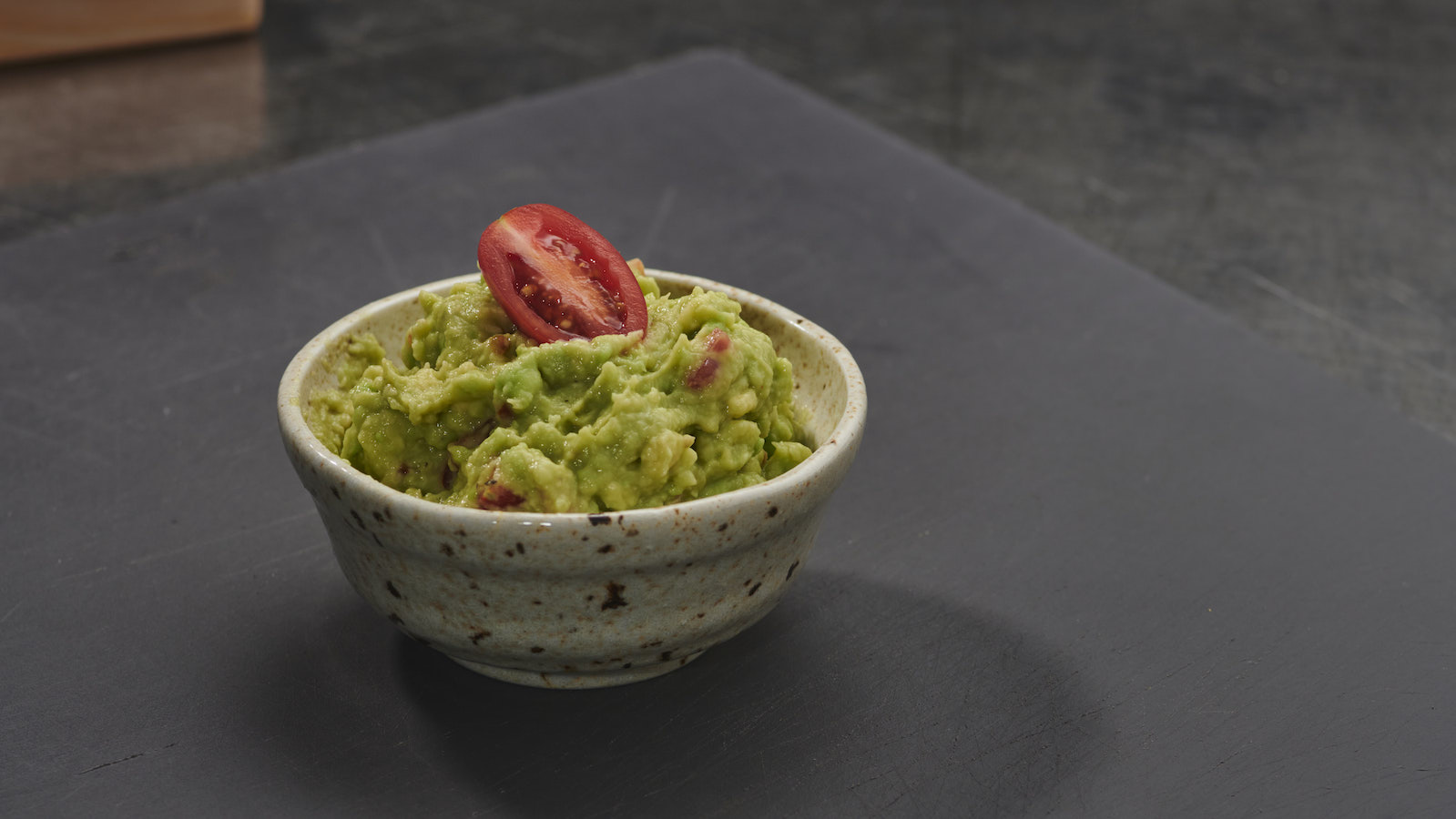 - Tomate, Zwiebel, Salz und Pfeffer zum Avocadomus geben und gut vermengen.