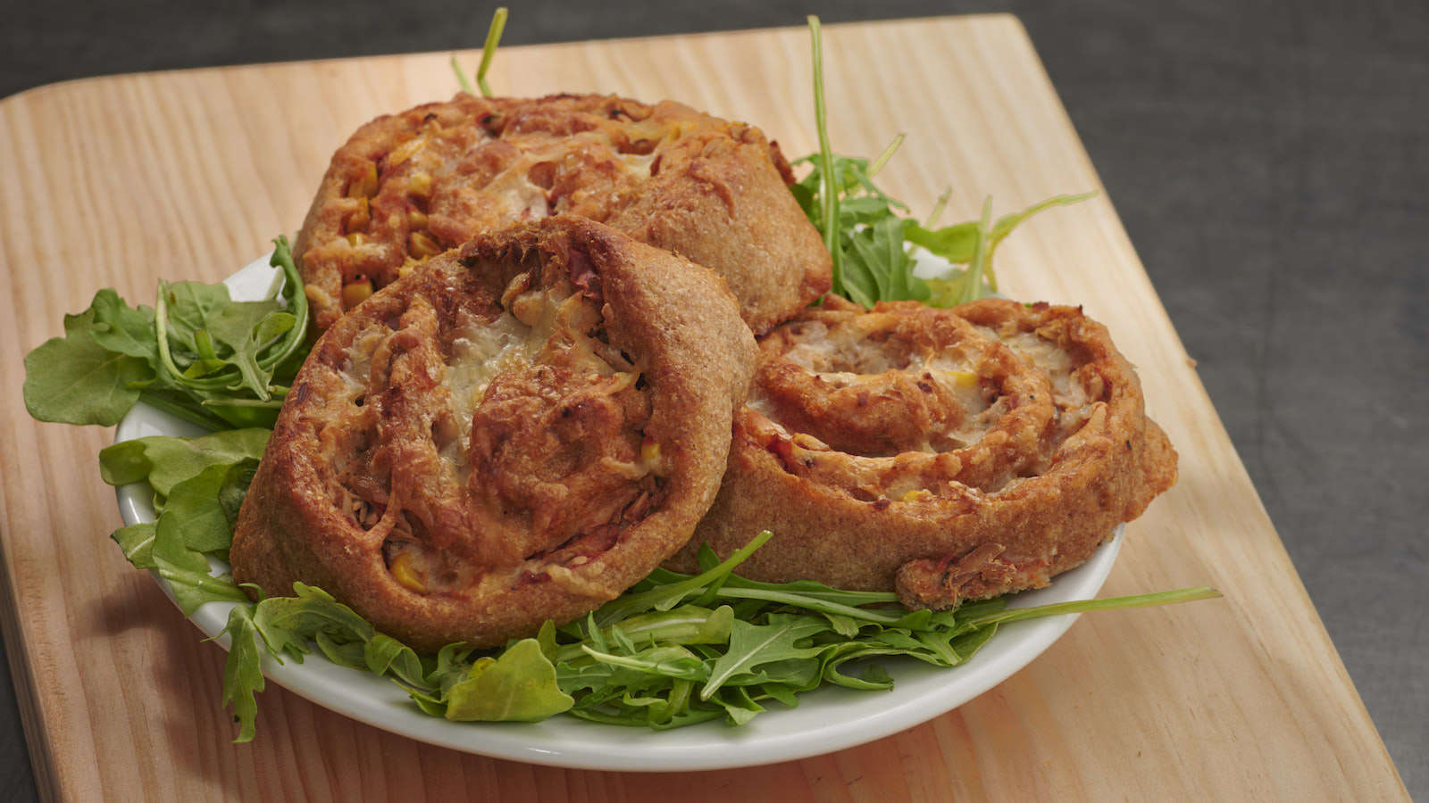 - Die Pizzaschnecken auf einem mit Backpapier ausgelegtem Backblech mit Abstand zueinander verteilen und etwa 20 Minuten goldbraun backen.