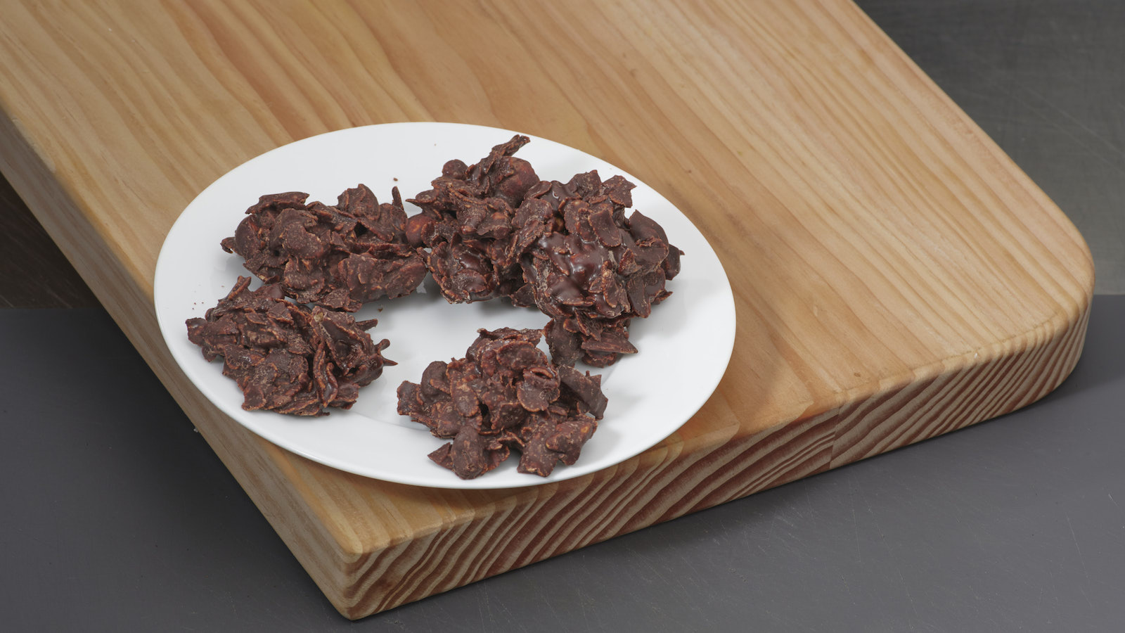- Cornflakes mit den Händen in eine Schüssel zerbröseln. Nüsse grob hacken, Trockenobst zerkleinern und hinzufügen.