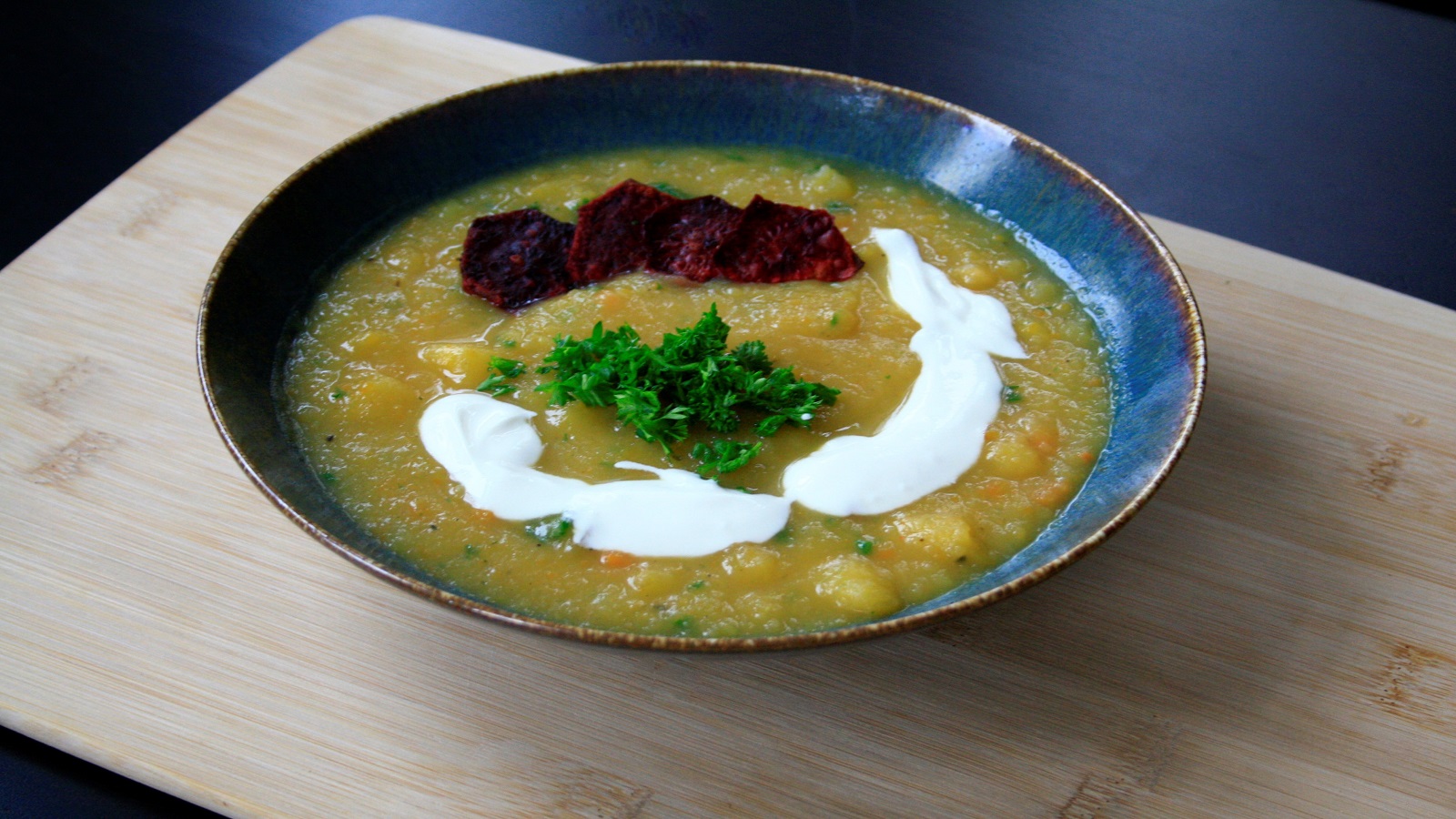- Schmand glattrühren. Suppe mit Schmand und Chips anrichten und mit Petersilie bestreuen. Dazu Brot reichen.