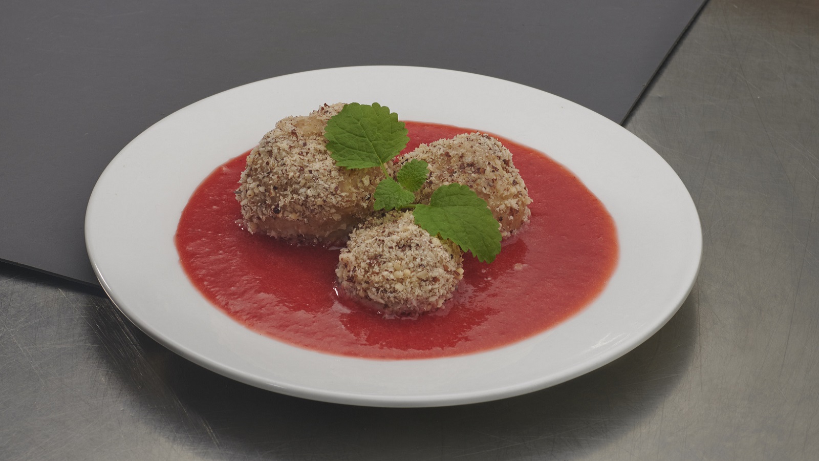 - Quarkknödel in den gerösteten Haselnüssen wenden und mit der Fruchtsoße servieren.