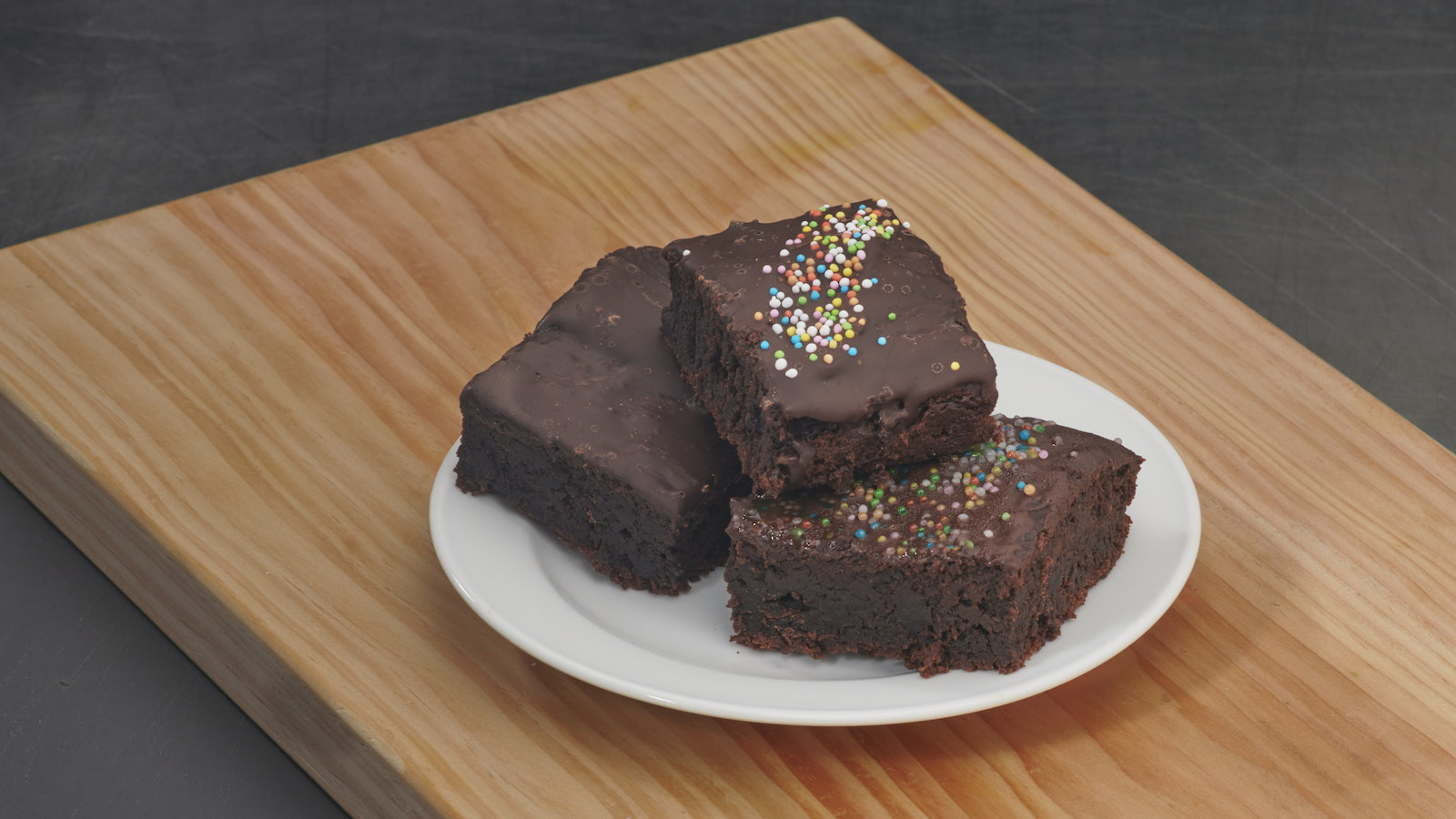 - Die Kuvertüre klein hacken, in einem Wasserbad schmelzen und die abgekühlten Brownies damit überziehen. Nach Belieben noch mit bunten Zuckerperlen verzieren.