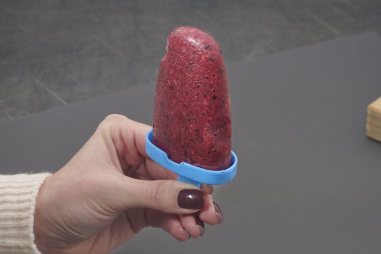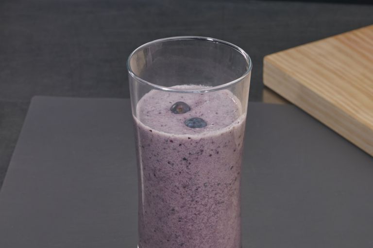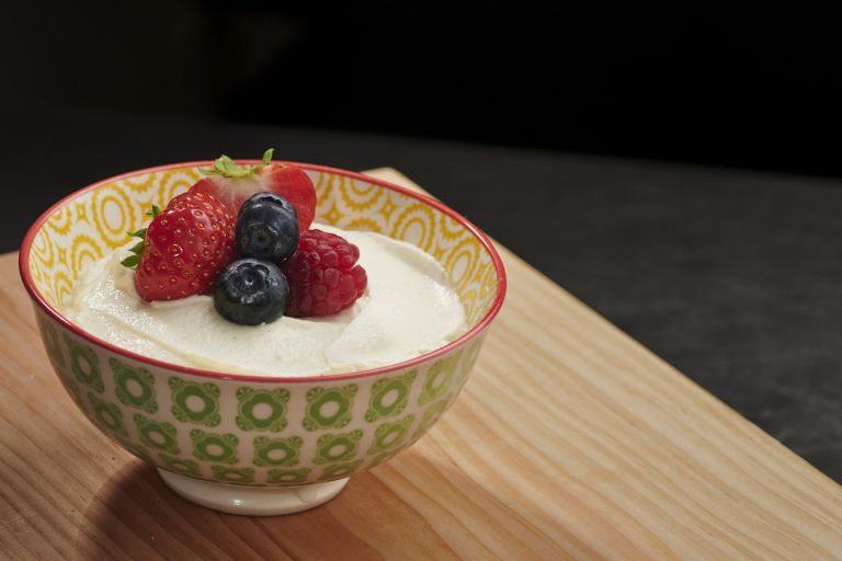 Obst pürieren und dann unter die Quarkspeise heben – so bekommt der Quark eine andere Farbe.