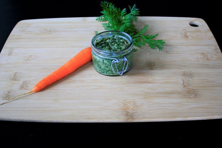 Meist landet Karottengrün im Abfall, bestenfalls noch in der Hasenbox. Dabei lässt sich das Grün von Bio-Karotten super zu einem leckeren Pesto zubereiten.