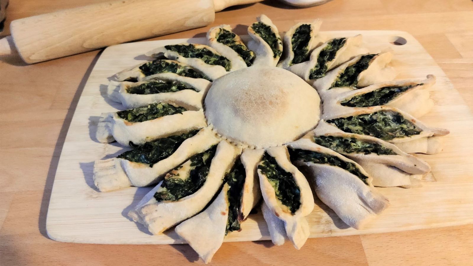 - Anschließend den Ring etwa alle 2 cm einschneiden, sodass gleichgroße „Sonnenstrahlen“ entstehen und diese jeweils um 90° auf die Seite drehen. Die Spinatsonne nun für ca. 30 Minuten backen.